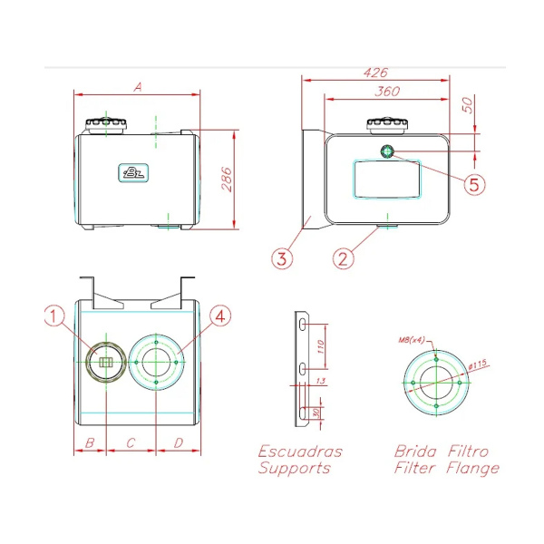 Depósito de aceite para montaje lateral con brida filtrante e indicador de nivel. Acabado en acero pintado.