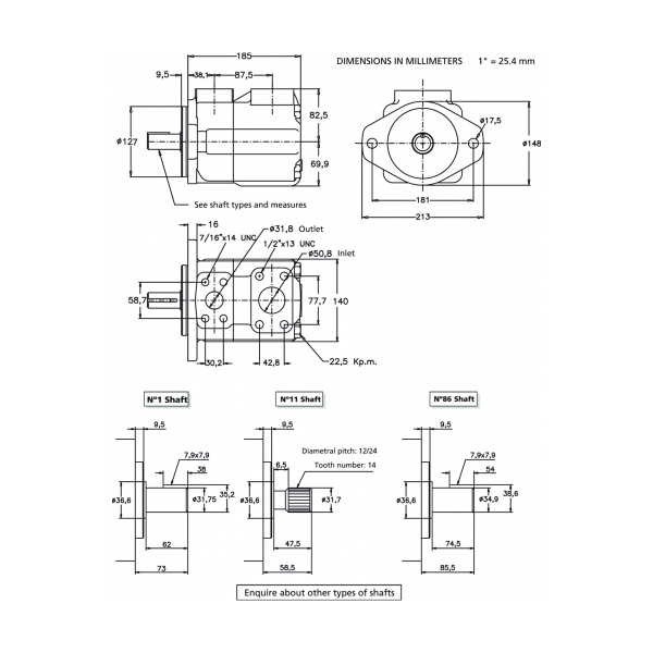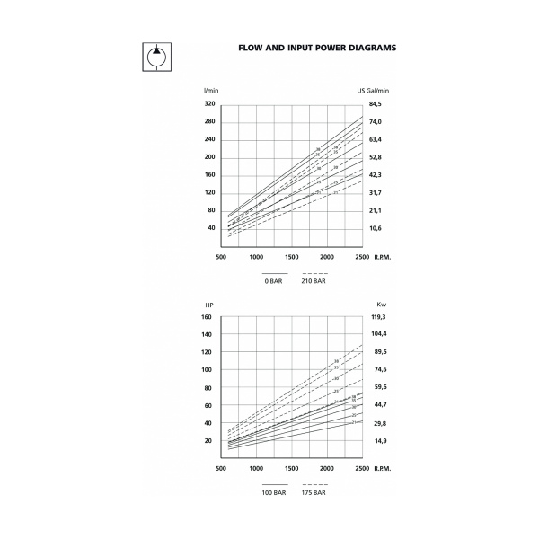 Caudales disponibles: 21, 25, 30, 35, 38 y 45 Gal/min. a 1200 rpm