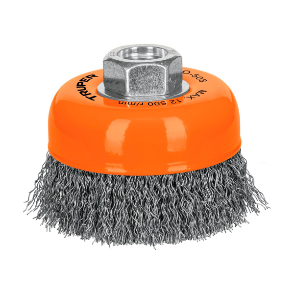 Carda copa 3" alambre ondulado fino, eje 5/8"-11, Truper
