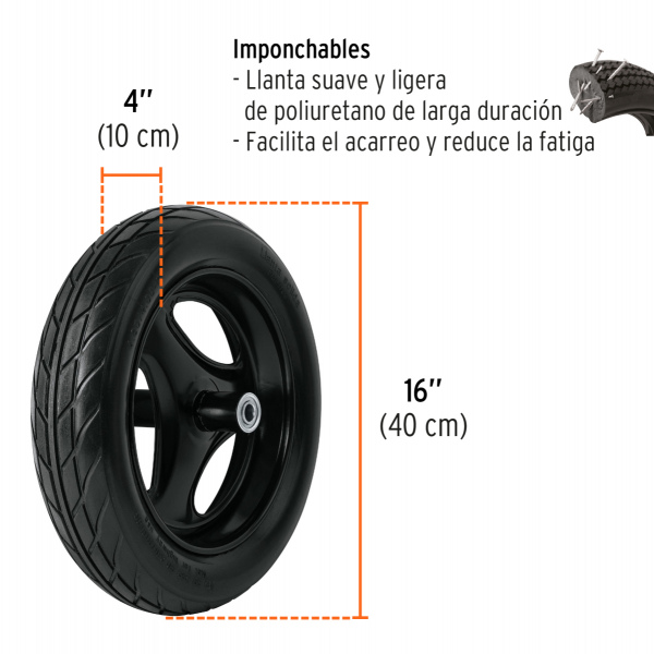 -Llanta imponchable suave y ligera de poliuretano con rin 3 aspas, brinda mejor amortiguamiento en terrenos irregulares y mayor estabilidad