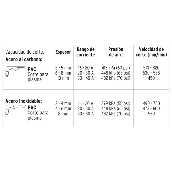 -Capacidad de corte en acero al carbono (Hasta 10 mm) y acero inoxidable (Hasta 8 mm)