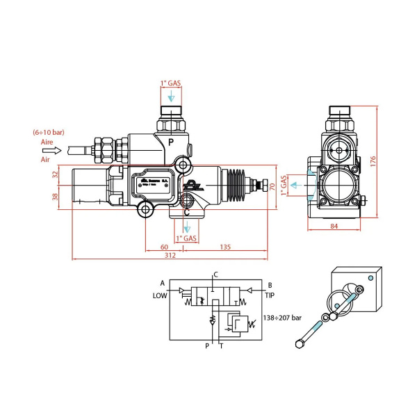 Válvula para volquete de centro abierto proporcional, 180 litros. Válvula limitadora con selector neumático para dos rangos de presión