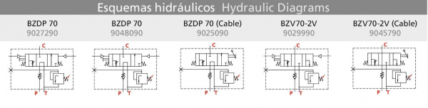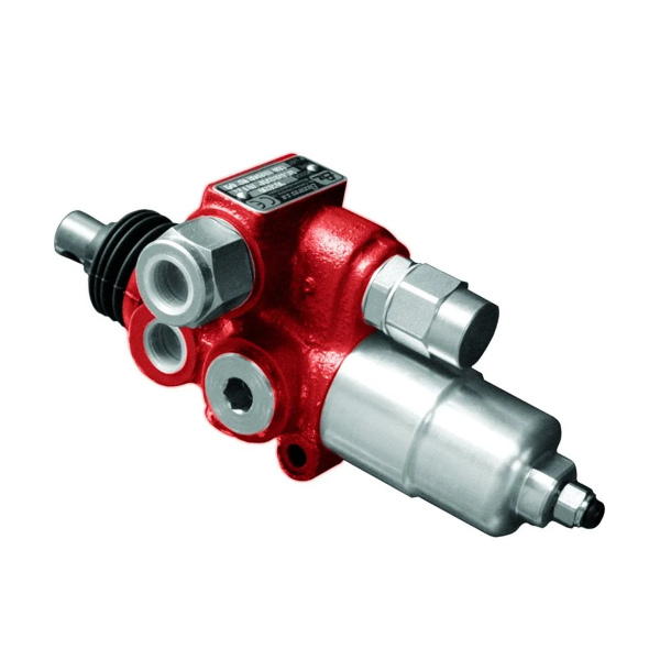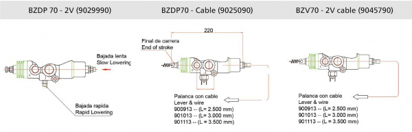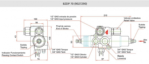 Válvula para volquete, centro abierto proporcional o centro cerrado de 2 velocidades de bajada de 70 litros con accionamiento neumático o mecánico, con válvula limitadora de presión ajustable hasta