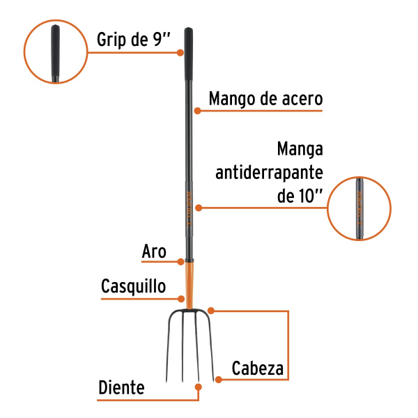 Bieldo para paja, 4 dientes, mgo largo de acero 48"