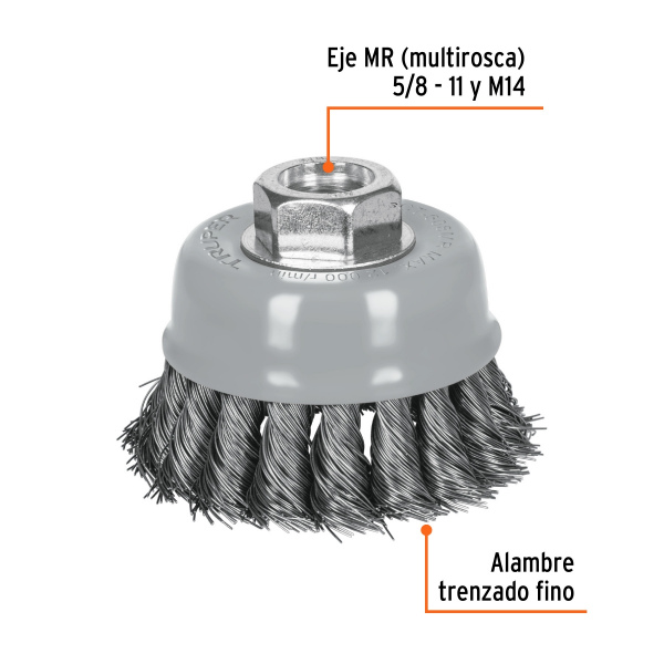 Carda copa 3" alambre trenzado fino, Multi-rosca, Truper
