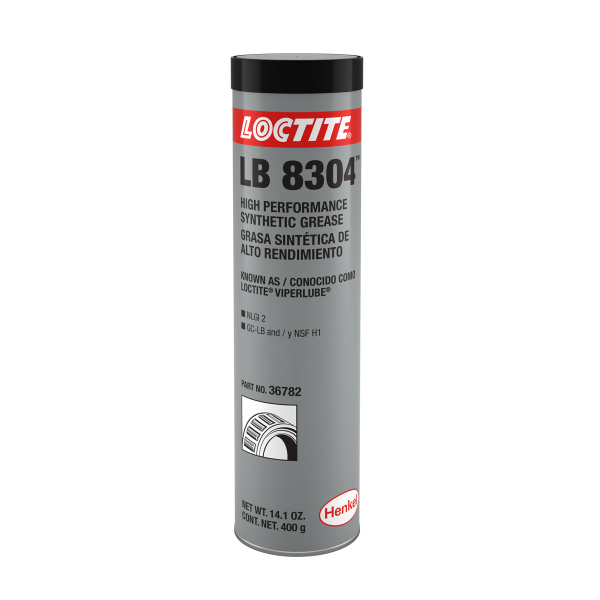 Grasa LB 8304 de Loctite es fácil de usar. Este producto está formulado para usarse en equipo automotriz. El ingrediente principal consiste en sintético. Está clasificado como Grado alimenticio y NLGI 2. Además de sus otras características este producto es resistente al óxido y reúne los siguientes estándares: NSF H1. Viene en un 400 g Cartucho. Anteriormente conocido como Loctite Viperlube. El número IDH de este artículo es 457457. Este grasa cumple las siguientes normas: NSF H1.