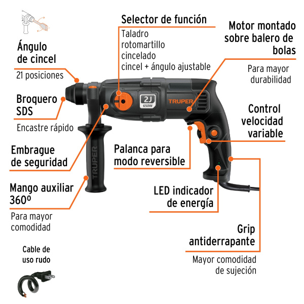 Rotomartillo SDS Plus 2 Joules, 650W, TRUPER INDUSTRIAL
