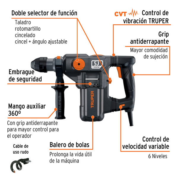 -Mango con sistema de Control de Vibración Truper (CVT) que reduce las vibraciones, haciendo el trabajo más confortable y seguro para el operador